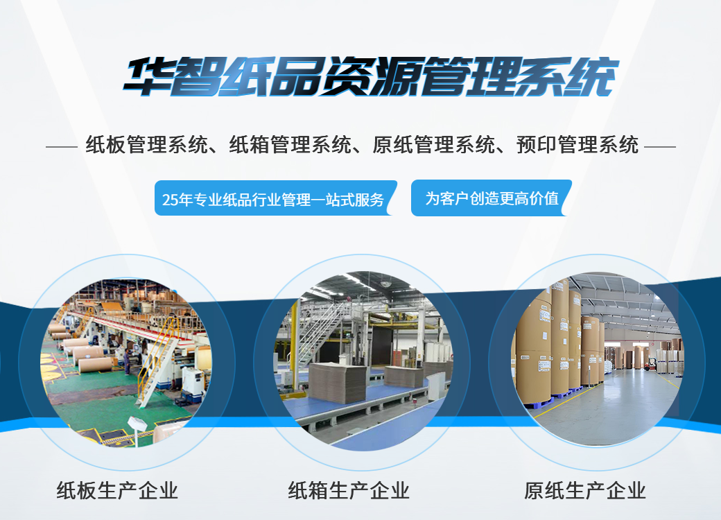 《华智纸品管理ERP》按业务范畴分为:预印管理系统、纸板管理系统、纸箱管理系统、原纸管理系统、辅料管理系统、财务管理系统等子系统;专业应用于纸品包装行业:原纸生产厂家、纸板生产厂家、纸箱生产厂家、纸箱预印厂家等。