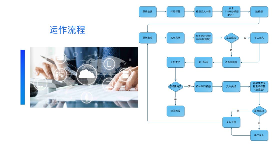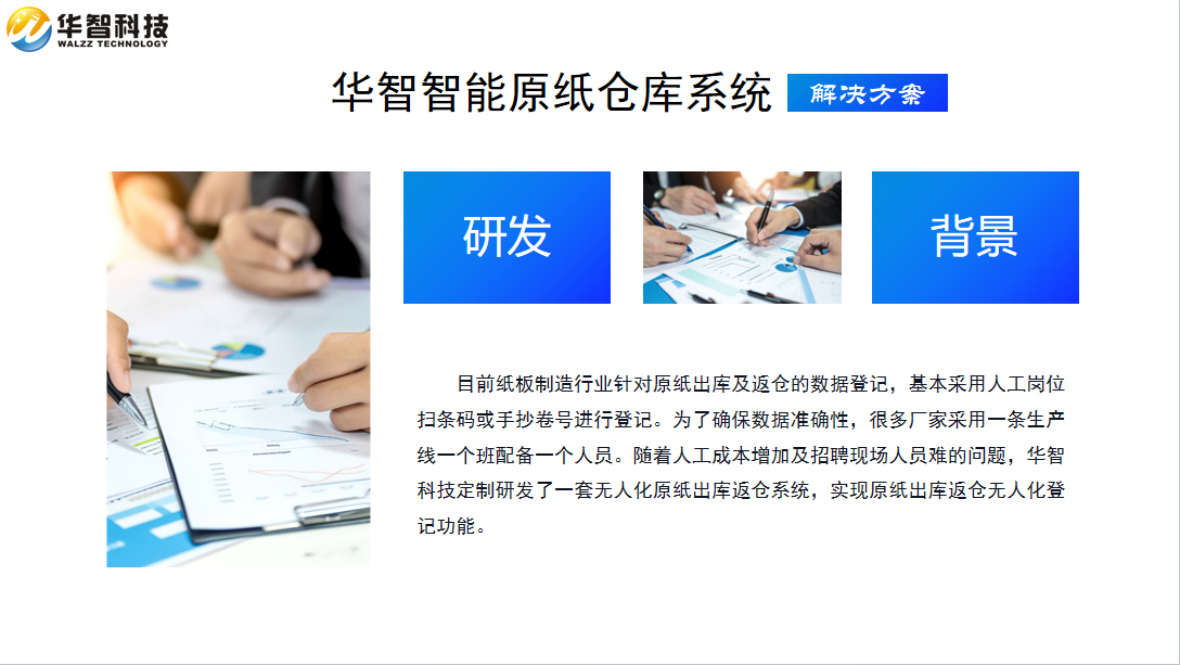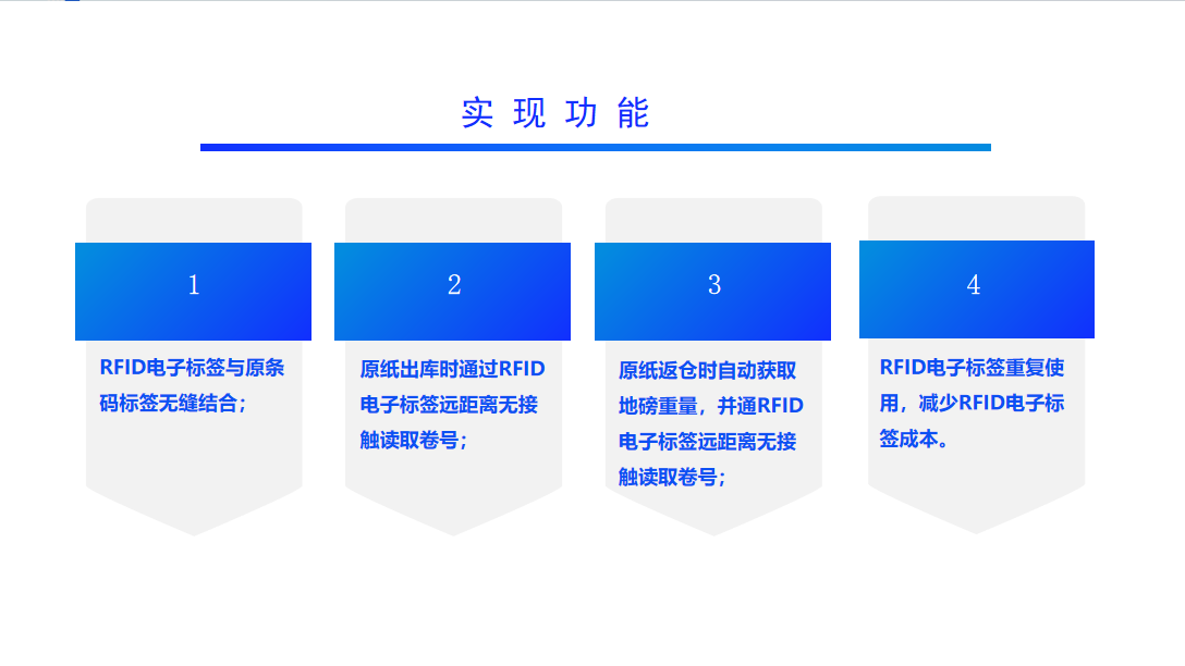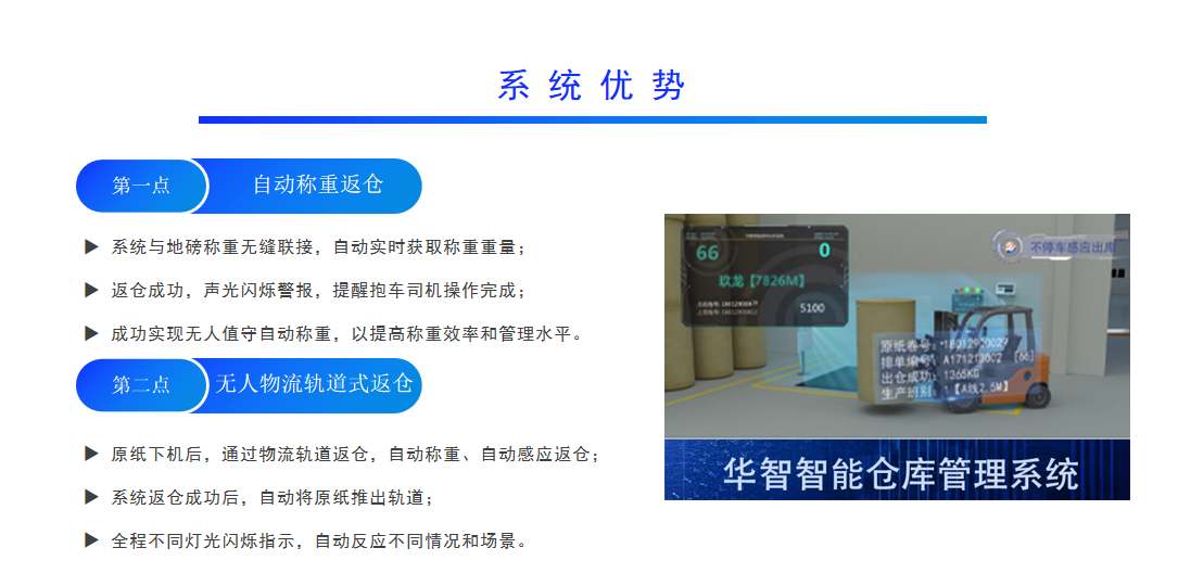 实现原纸出库返仓无人化登记功能,感应式出仓,自动称重返仓及无人物流轨道式返仓。