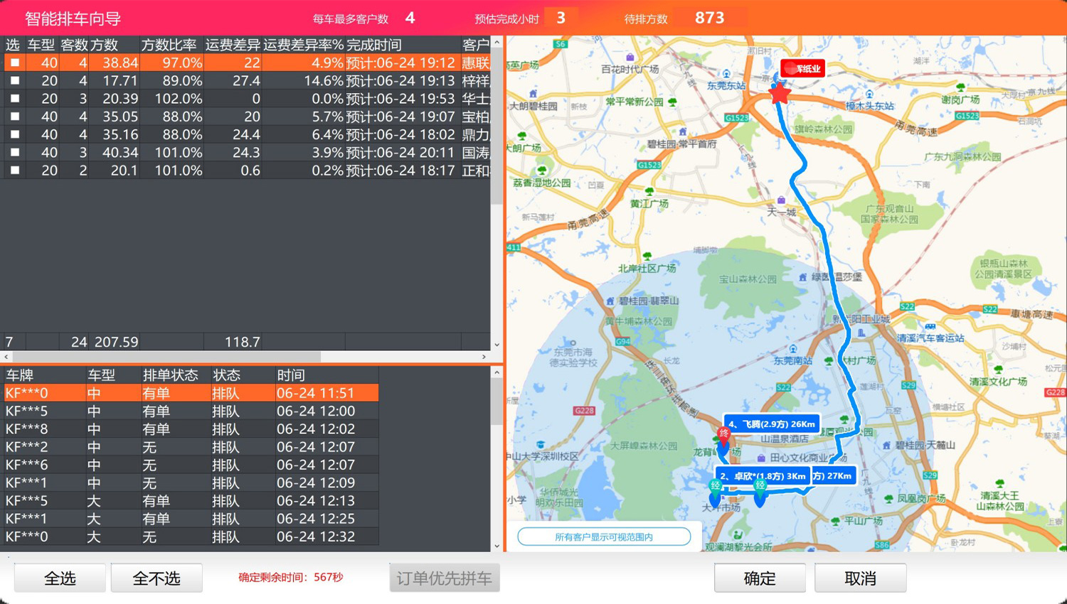 B、多纬度自动实现优解的排车方案:生管预估时间、跟单员追单急单、线路基于地图实时优化、 运费差率小化、车型选则;